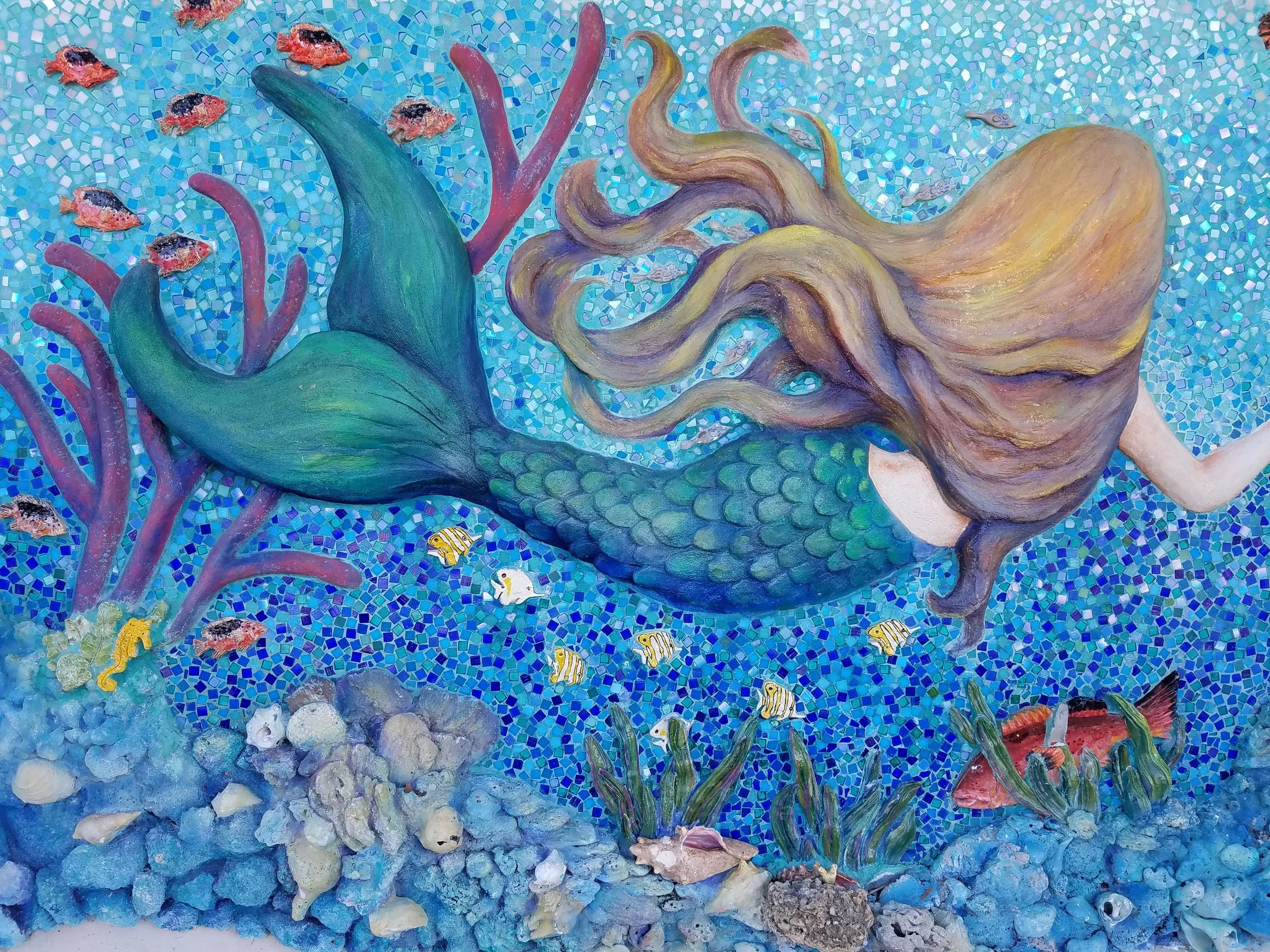 “Save Our Coral Reefs” mosaic art project by Taylor Komarra, Heather Ackers, Brenda Leigh, Jensen Beach High School students, and community artists. Photograph by Sheila Herrera.